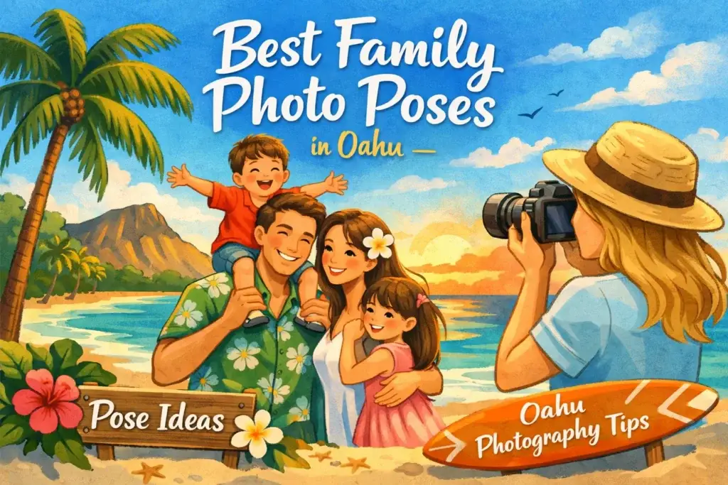 Family photography poses for Oahu events, from classic group setups to candid action shots. See 8 tried-and-tested options and book your session with us.
